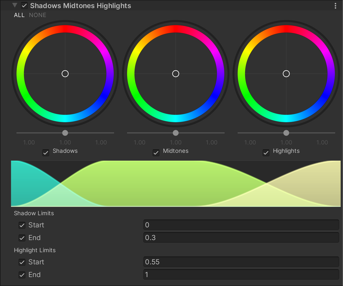 - In the Inspector, navigate to Add Override > Post-processing and click on Shadows Midtones Highlights. URP now applies Shadows Midtones Highlights to any Camera this Volume affects.
