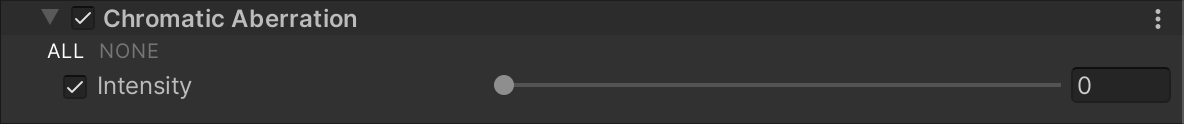 Intensity | Set the strength of the Chromatic Aberration effect. Values range between 0 and 1. The higher the value, the more intense the effect is. The default value is 0, which disables the effect. |