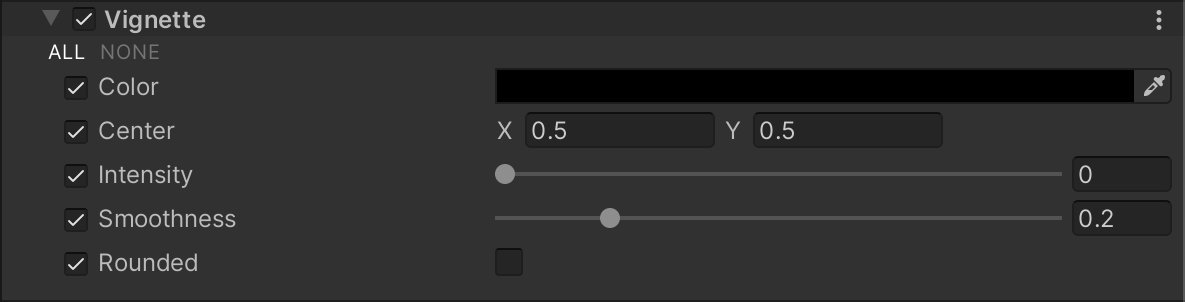 Rounded | When enabled, the vignette is perfectly round. When disabled, the vignette matches the shape on the current aspect ratio. |