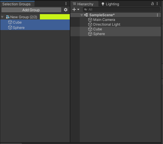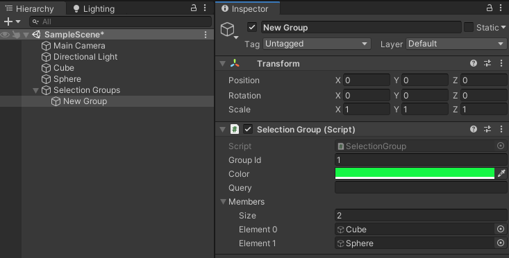 Selection groups allow a number of Unity Objects to be categorized under a common name. The selection group data is initially stored outside of the scene, and cannot be used by scripts. However, it can optionally be stored in a scene which allows the data to be used by scripts.