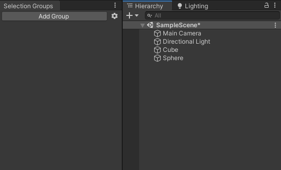 - Open the selection group window via Window -> General -> Selection Groups. A new window will open, it makes sense to dock this window next to the Hierarchy window.