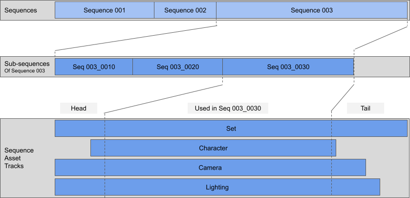 Conceptual example of Sequence Asset tracks cut throughout the Editorial structure.