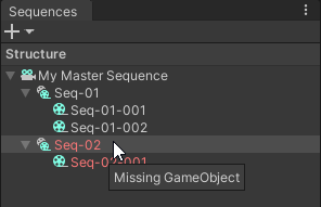 Example: Sequence and Sequence child that became invalid in the Sequences window after deletion of their GameObjects from the Hierarchy.