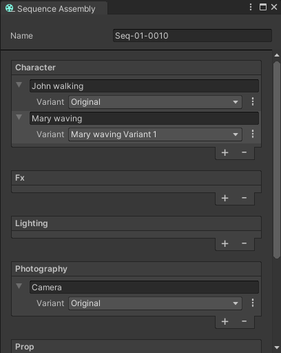 The Sequence Assembly window allows you to populate your Sequences with Sequence Assets and swap Sequence Asset Variants. From this window, you can also create and manage Sequence Assets and Variants in context.
