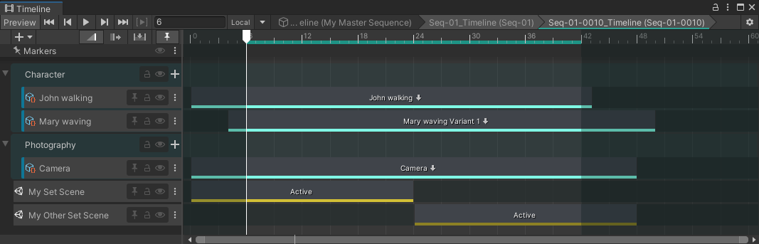 When a Sequence contains Sequence Assets, its Timeline includes one track per Sequence Asset, all regrouped by Asset Collection type.