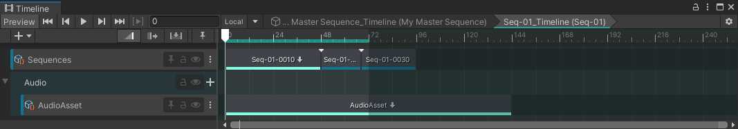 After: Seq-01 clip covers frames 0 to 96, and Seq-02 and Seq-03 clips accordingly shifted to the right. Notice the process ignored the AudioAsset clip length because it's not a Sequence clip.![]() |