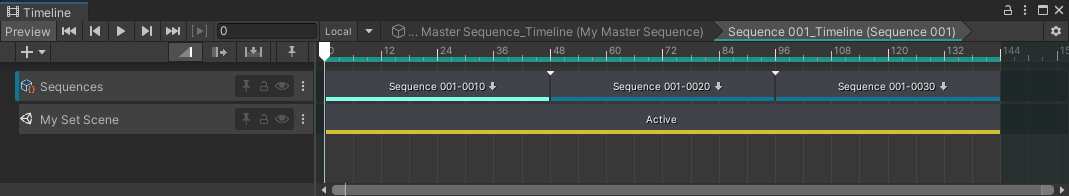 In the context of the Sequences package, the Timeline window allows you to edit, reorder and trim all Sequences and clips of your cinematic, and play them back for preview purposes.