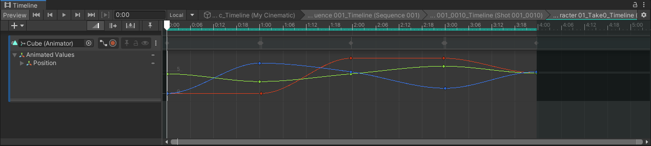 Example: Timeline of a Sequence Asset with a simple animation clip.