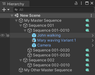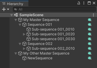 Each Sequence has a corresponding GameObject in the Hierarchy window, and the overall structure follows the hierarchy that you create through the Sequences window.