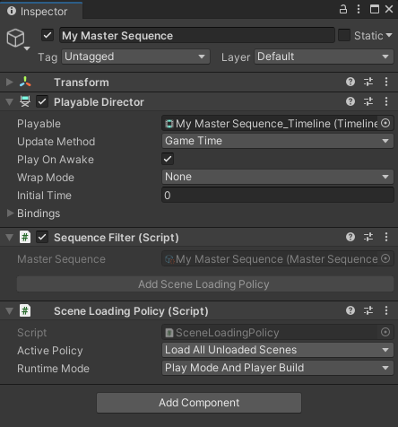- An optional Scene Loading Policy component, more likely on a Master Sequence, which helps you manage the automatic loading of Scenes in runtime if you are using Scene Activation Tracks in your Editorial.