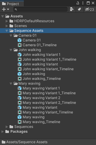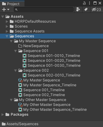 The Sequences folder contains all script and Timeline assets related to your Sequences, and its overall structure follows the hierarchy that you create through the Sequences window.