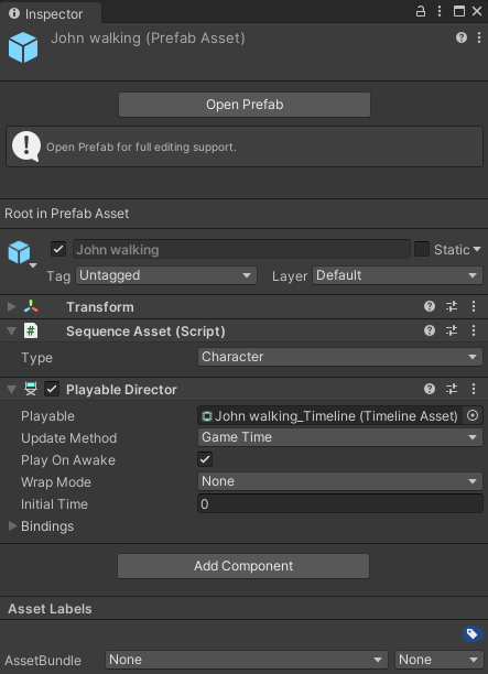 - A Playable Director that binds the Prefab with its Timeline asset.