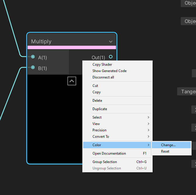 Shader Graph can display colors on nodes in your graph to improve readability. This feature uses Color Modes to change which colors to display in the graph. Use the Color Mode: drop-down menu in the top right corner of the Shader Graph Window to change the Color Modes.
