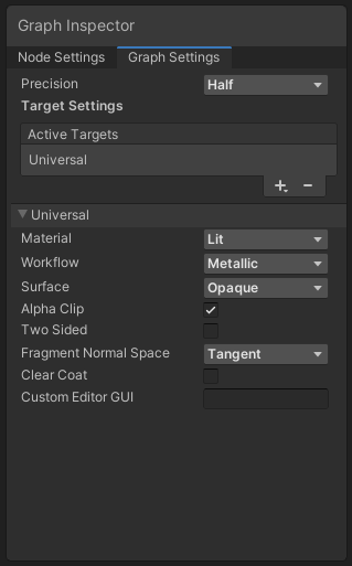 The Graph Settings tab on the Graph Inspector make it possible to change settings that affect the Shader Graph as a whole.