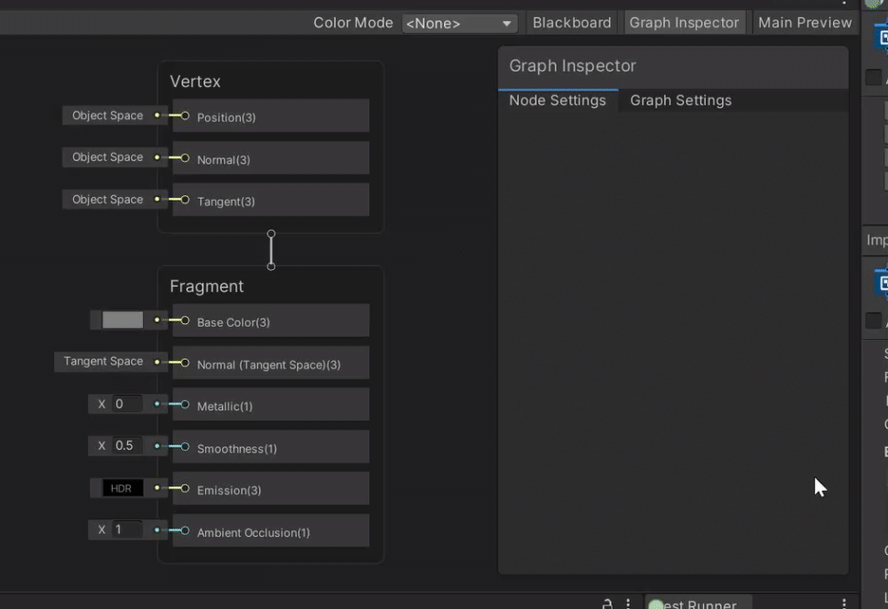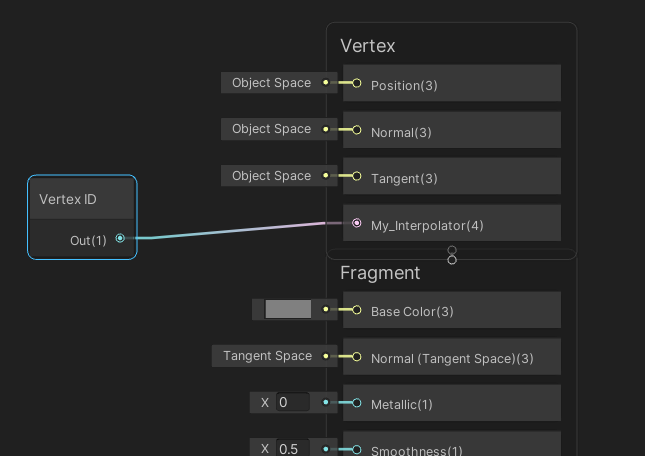 In this example, you connect to the Base Color block in order to pass the Vertex ID from the vertex shader to the fragment shader and use it as color output.