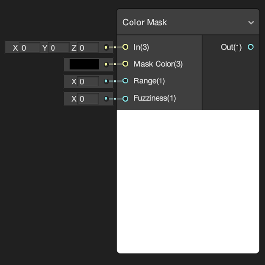 Masks values of input In on channels selected in dropdown Channels. Creates a mask from values in input In equal to input Mask Color.