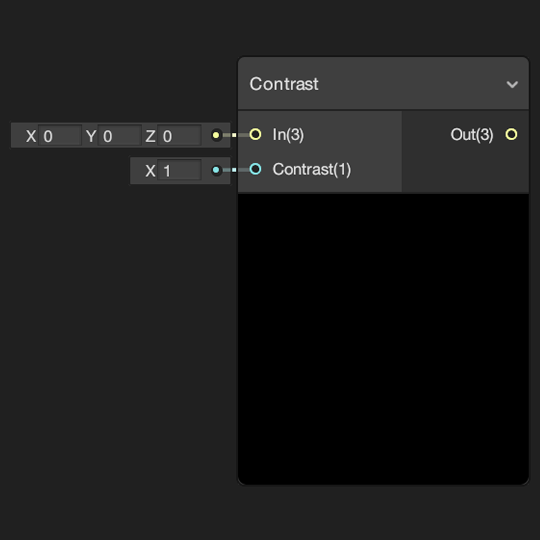 Controls the amount each of the channels of input In contribute to each of the output channels. Adjusts the contrast of input In by the amount of input Contrast.