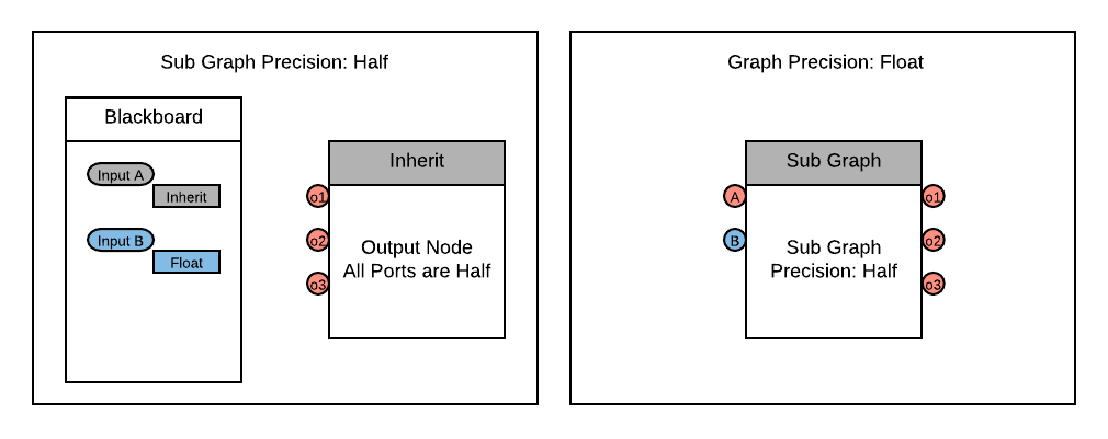 For example, set the Sub Graph Precision to half, and the Graph Precision to float. Then set both Input A and the Output node to inherit. The input and output ports of the Sub Graph inherit half from the Sub Graph Precision, even though you set the Graph Precision to float. If you want the inherit behavior of the Sub Graph to match that of the main graph, you must set the Sub Graph Precision to float as well.