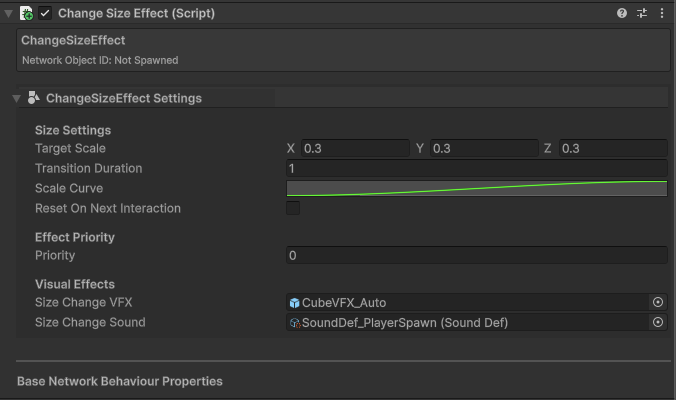 The Change Size Effect is a custom interaction effect that modifies the player's scale when they interact with an object. It demonstrates how to extend the Modular Interaction System to create networked gameplay mechanics.