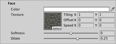 | Face | Control how much the bump map affects the text face. A value of 0 shows no effect while a value of 1 shows the full effect of the bump map. |