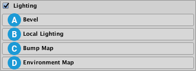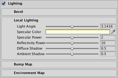 These settings control simulated local directional lighting. They work in combination with the Bevel, Bump Map, and Environment Map settings.
