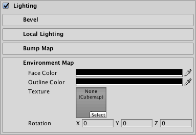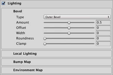 | Outline | Control how much the bump map affects the text outline. A value of 0 shows nothing while a value of 1 shows the full effect of the bump map. |