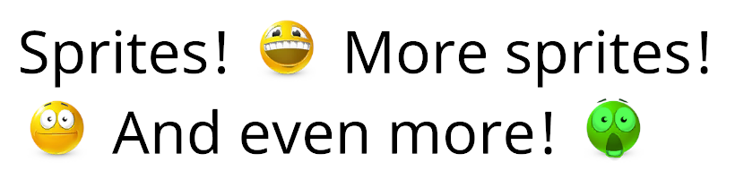 Sprites! <sprite=0> More sprites! <sprite index=3> And even more! <sprite name="Default Sprite Asset_4" color=#55FF55FF>