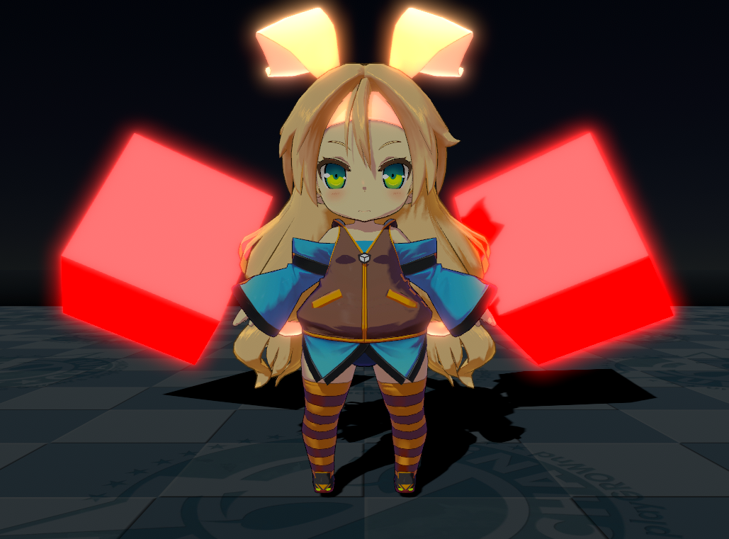 A chibi-style model standing between two red cubes, which light the model with emissive light.