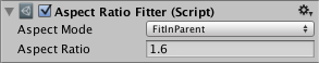 It can adjust the height to fit the width or vice versa, or it can make the element fit inside its parent or envelope its parent. The Aspect Ratio Fitter does not take layout information into account such as minimum size and preferred size.
