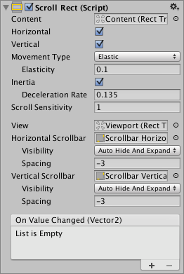 | On Value Changed | A UnityEvent that is invoked when the scroll position of the Scroll Rect changes. The event can send the current scroll position as a Vector2 type dynamic argument. |