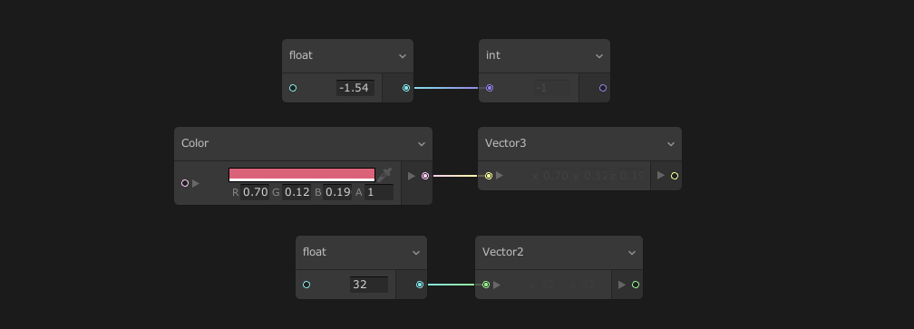 Properties can connect between base types to perform a cast. Casts change the data type you are working on in order to inherit its properties. For example, if you cast a float to integer, the float can use integer division.