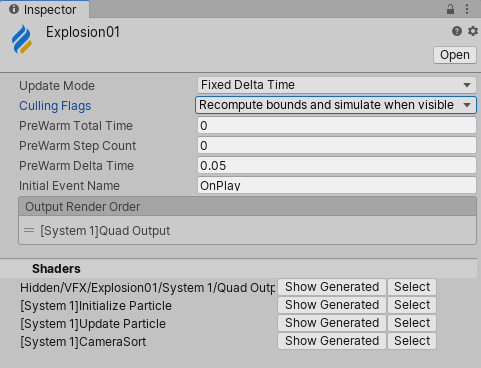 | Update Mode | Sets the rate at which Unity updates the visual effect: •Fixed Delta Time: Updates the visual effect at the rate that the Fixed Time Step property defines in the Visual Effect Project Settings. • Delta Time: Updates the visual effect every frame. |