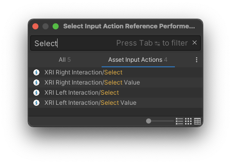 - Find the specific action that you want to use for this component's input. The names in the default input action asset correspond to the type of interaction or locomotion controlled by each property. You can use the search field in the object picker dialog to narrow the choices shown in the list.