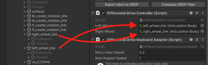 angular.z - This is the target velocity around the z axis. A positive value means rotation in the clockwise direction when viewed from the top of the robot downwards. A negative value will rotate the robot counter-clockwise. Same as with linear velocity, the calculated targets are sent to the ArticulationBody drives that are defined in the left and right wheel fields for each pair.