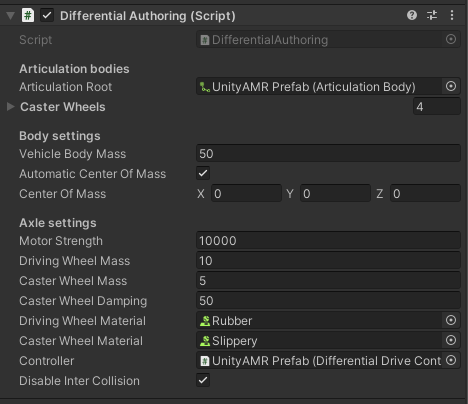 - Disable Inter Collision - Whether to disable colliders of the robot colliding with each other. This is useful when the different colliders of the robot are overlapping each other and causing simulation instabilities. For the UnityAMR this should be set to true
