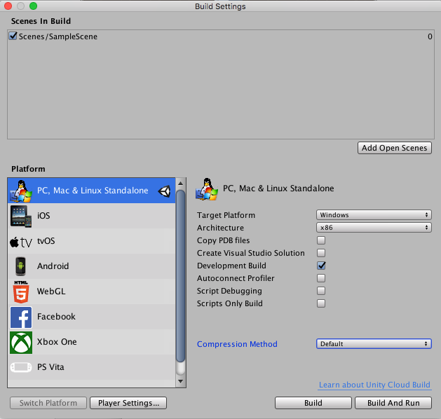 1.选择 File > Build Settings__,然后在 Platform__ 下选择 PC, Mac & Linux Standalone。将 Target Platform 设置为 Windows__,将 Architecture__ 设置为 x86_64__,然后单击 Development Build__ 复选框。