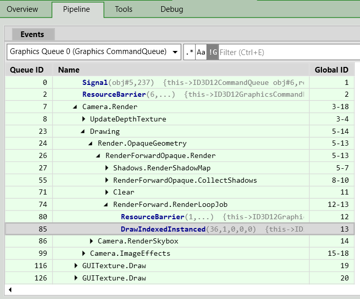 10.选择 Pipeline __ 选项卡,然后使用 Events__ 窗口导航到您感兴趣的绘图调用。