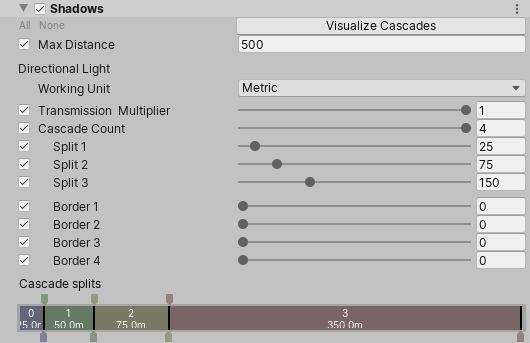 | Border 4 | 设置最终级联分割终点的边界大小。HDRP 在此距离上淡出最终阴影级联。Working Unit 定义了该属性使用的单位。 |