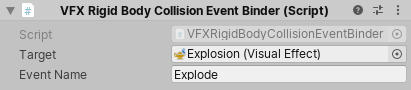 每当有物体与附加到与此组件相同的游戏对象的刚体发生碰撞时,Rigid Body Collision Event Binder 就会在目标视觉效果中触发一个事件。此绑定器还将碰撞世界位置附加到 position