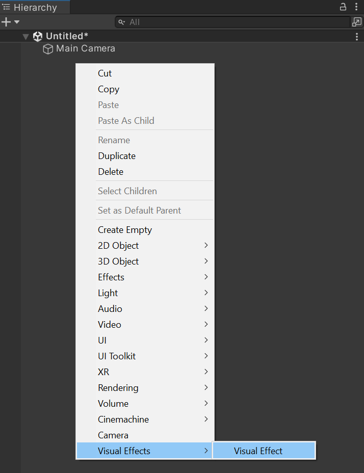 要在 Hierarchy 窗口中创建 Visual Effect 游戏对象。