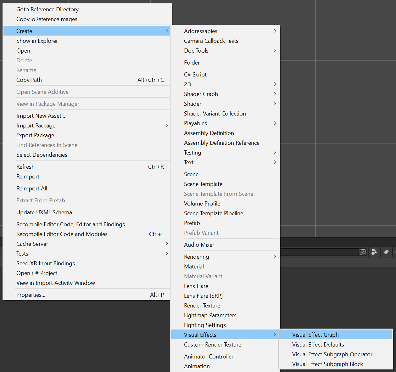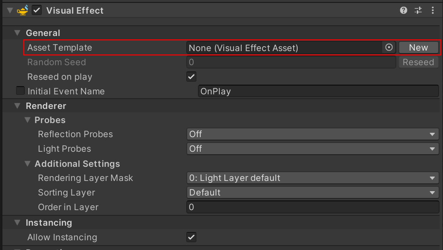 通过选择资源 (Assets) > 创建 (Create) > 视觉效果 (Visual Effects) > 视觉效果图形 (Visual Effect Graph) 创建新的 VFX 资源。然后在 Project 窗口的 Asset 文件夹中创建 VFX 资源。