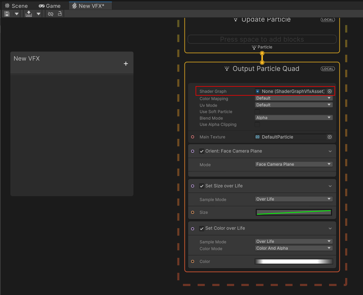 双击资源打开 Visual Effect Graph。要选择 Shader Graph 资源,请转到 Output Particle Quad 面板,找到 Shader Graph 并选择资源选择器(圆圈)。
