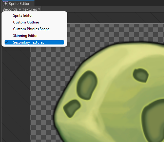 首先选择一个精灵 (Sprite),然后从其检视面板 (Inspector) 窗口中打开精灵编辑器 (Sprite Editor)。然后从编辑器窗口左上角的下拉菜单中选择辅助纹理 (Secondary Textures) 模块。