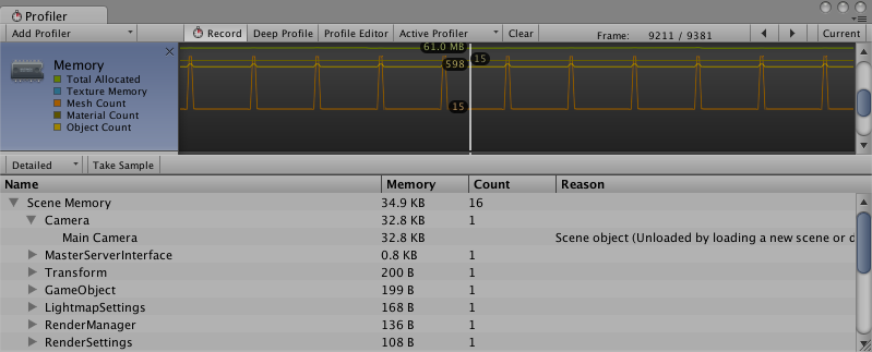 • Object Count es el número total de Objetos que se crean. Si este número crece a través del tiempo entonces esto significa que su juego está creando algunos objetos que nunca se destruyen.