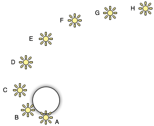 Por ejemplo, si hay algún objeto que está afectado por una cantidad de luces (como un círculo en una foto abajo, afectado por luces A a H):