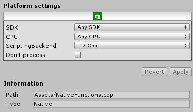 Es posible agregar archivos de código C++ (.cpp) directamente a su proyecto de Unity, que funcionará como un plugin en el Plugin Inspector. Si es configurable para que sea compatible con Windows Store y IL2CPP scripting backend, estos archivos C++ serán compilados juntos con el código C++ que es generado de managed assemblies: