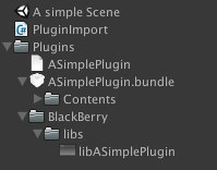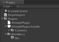Open the “Unity Project Plugin” (the project we unzipped earlier) within Unity and create the following directory path within the project panel: Assets/Plugins/BlackBerry/libs