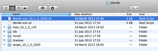 In order to set up the paths needed to build BlackBerry object and shared libraries open a terminal window and navigate to the folder which contains this file. Type the command: