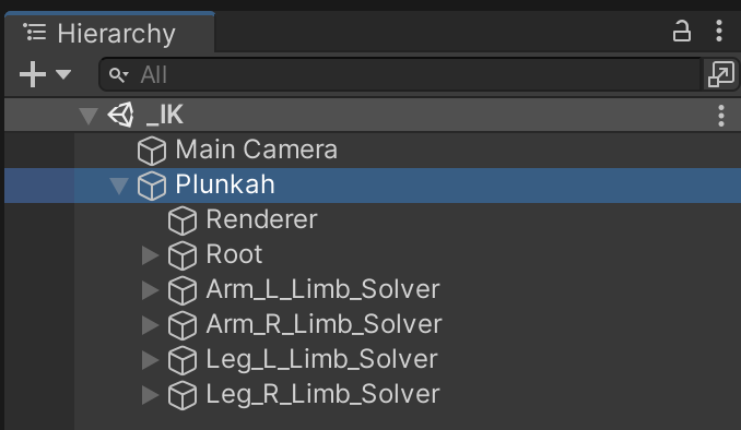 使用する IK Solver のタイプを選択して、IK Solvers リストに追加します。IK Solver は、ゲームオブジェクトとして階層にも追加されます。