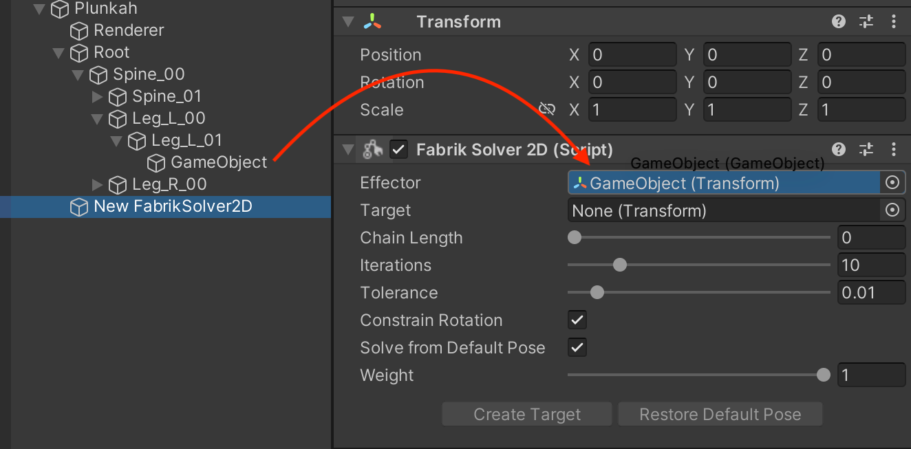 - IK Solver を選択します。Inspector ウィンドウを開き、トランスフォームをドラッグして階層から Effector フィールドに移動します。
